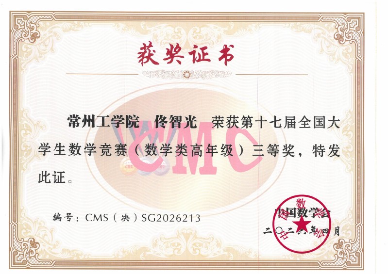 4月17日至19日,第十七届全国大学生数学竞赛决赛圆满落幕。我校理学院2022级数学与应用数学专业佟智光同学在指导教师黄星、陈荣军的悉心指导下,凭借扎实的专业功底和出色的临场发挥,荣获数学专业组国家级三等奖。这一成绩不仅实现了我校在该项赛事全国决赛中获奖零的突破,更是继2024年首次闯入非数学专业组(2020级应用统计专业朱治戎)决赛并获奖后,我校在全国大学生数学竞赛史上树立的又一座里程碑。我校成为在常地区唯一进入全国数学专业组决赛的高校。